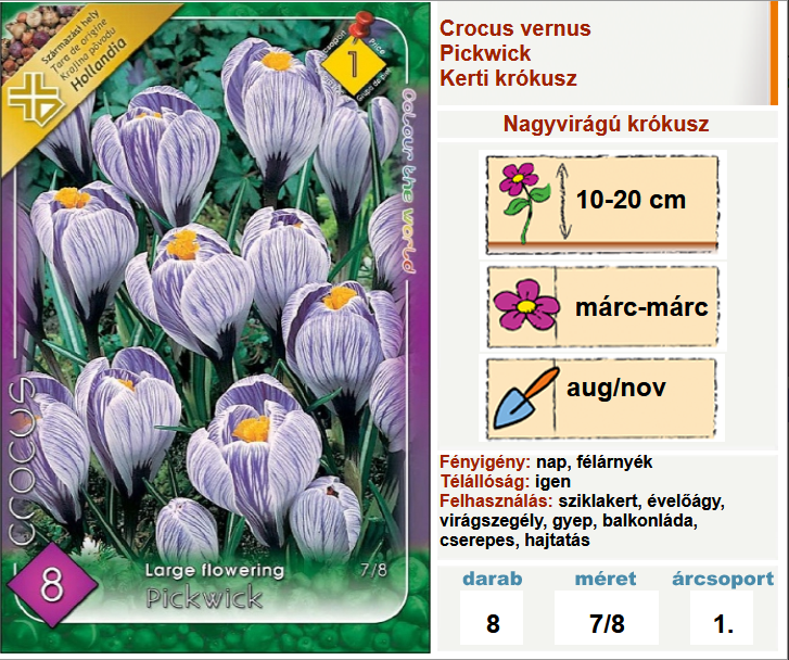 Krókusz Large Flowerin Pickwick (7/8, 8 db) NAGYVIRAGÚ KRÓKUSZOK: A legkorábban virágzó hagymás növények. Már február márciusban virágoznak. Egy hagyma 2-4 virágot is hoz. Több évig egy helyben hagyva jól szaporodnak és évről-évre gazdagabb virágpompával jelzik a tél elmúltát. Igénytelen, szinte mindent kibíró növények. A kertben vagy sziklakertben kisebb-nagyobb csoportokba telepítve a legszebbek. Tárolás ültetésig száraz, hűvös helyen. Ültetés 8 cm mélyre és legalább 8 cm-re a másik növénytől. [...] Részletek