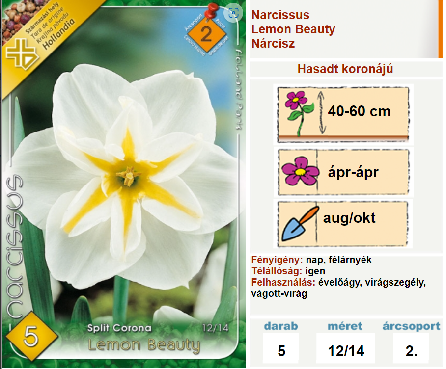 Nárcisz hagyma Lemon Beauty (12/14, 5 db) A nárciszok szinte minden talajon jól fejlődnek. Szeptembertől decemberig ültethetők. Legszebbek nagyobb önálló csoportokba vagy ágyásba ültetve. Kiválóak vágott virágnak. Ültetés 10 cm mélységbe, 10 cm-re a másik virágtól. [...] Részletek