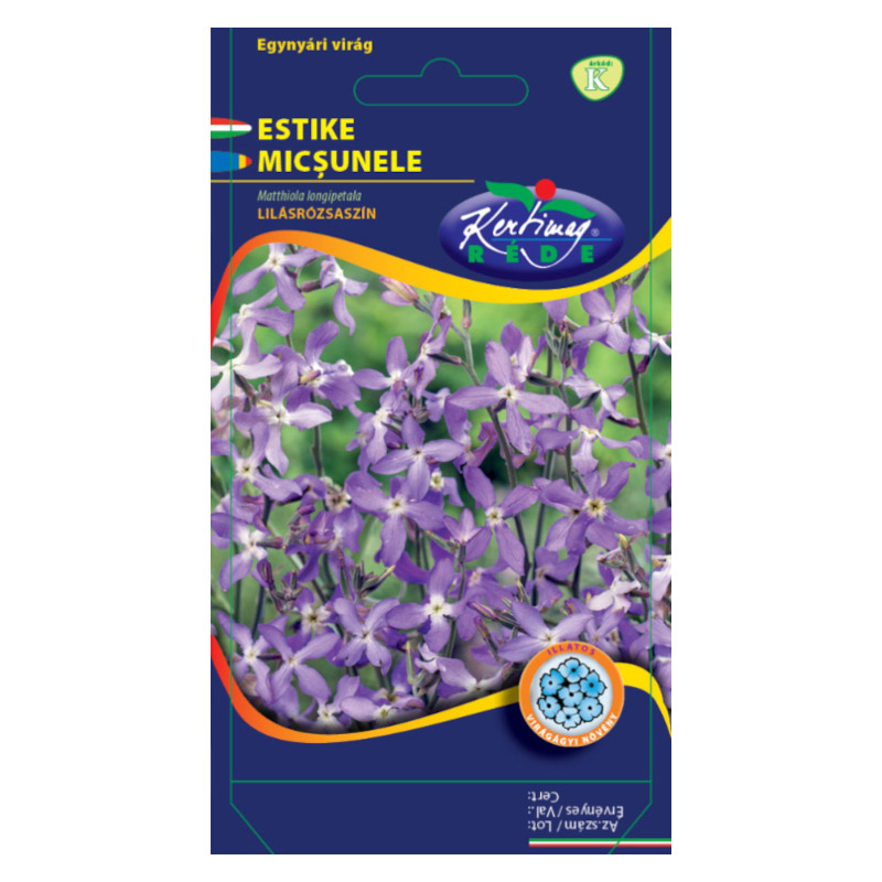 Estike (Matthiola bicornis) lilásrózsaszín (0,5 g) Lazán elágazó, szürkészöld levelű, 25-30 cm magas növény. Este nyíló virágai pompás illatuk miatt értékesek. Márciustól kezdve több szakaszban vethetjük az állandó helyére. A vetést ne takarjuk, mivel fényre csírázik. [...] Részletek
