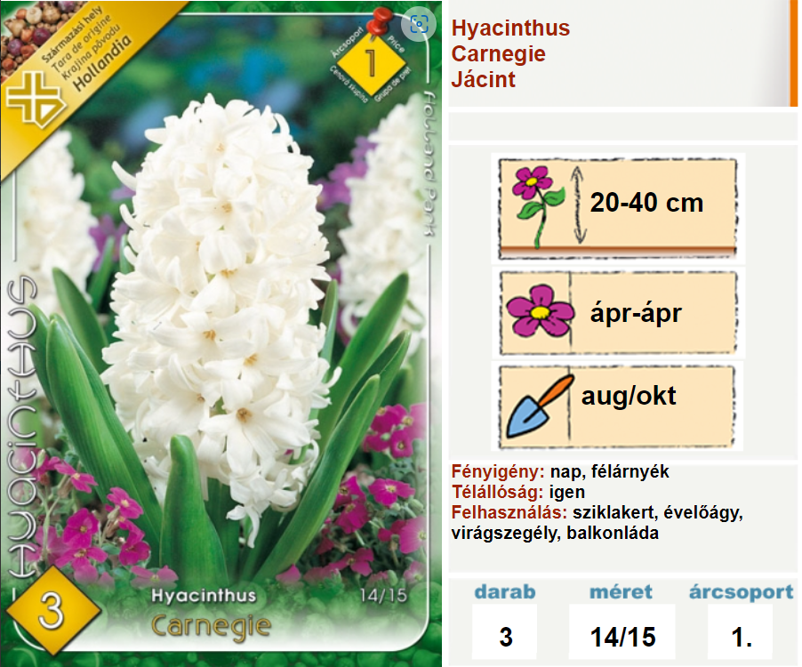 Jácint hagyma Carnegie (14/15, 3 db) A legtöbb talajon jól fejlődnek. Szeptembertől decemberig ültethetőek. A legszebb hatást úgy érhetjük el, ha legalább 5-6 azonos színű jácintból álló csoportokat alakítunk ki. Szín és illatpompájuk felülmúlhatatlan. [...] Részletek