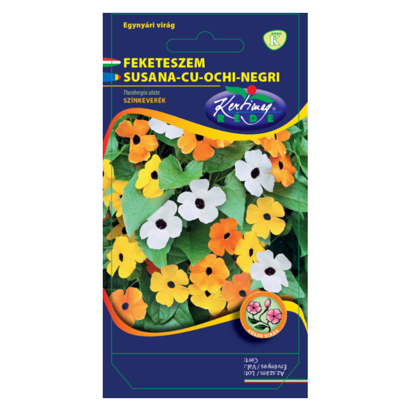 Feketeszem (Thunbergia alata) színkeverék (0,5 g) Napos helyekre, rézsűkre, falakra kiválóan alkalmas, gyorsan növekedő kúszónövény. Mutatós, tölcsér alakú virágai a nyílhegy alakú levelei fölé emelkednek. Kifejezetten napfényigényes. Jó vízelvezetésű talajt igényel. [...] Részletek