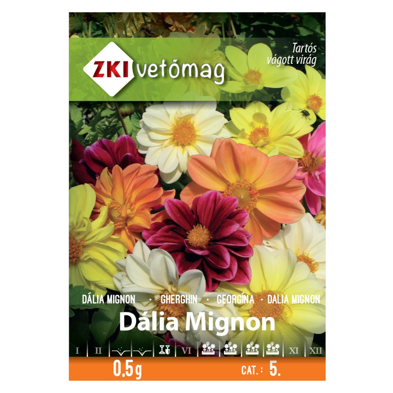 Dália (Dahlia variabilis) egyszerű virágú Mignon színkeverék (1 g) Egynyári virágágyak díszítésére az alacsony mignon és a valamivel magasabb féltelt virágú fajták alkalmasak, melyek magvetéssel is jól szaporíthatók. Márciusban fűthető fólia alá vagy langyos ágyba vetjük. Fagyérzékeny, ezért állandó helyére csak május második felében kerülhet. Gumós töveit ősszel felszedve a nagyvirágú dáliákhoz hasonlóan teleltetjük a kiültetésig. [...] Részletek
