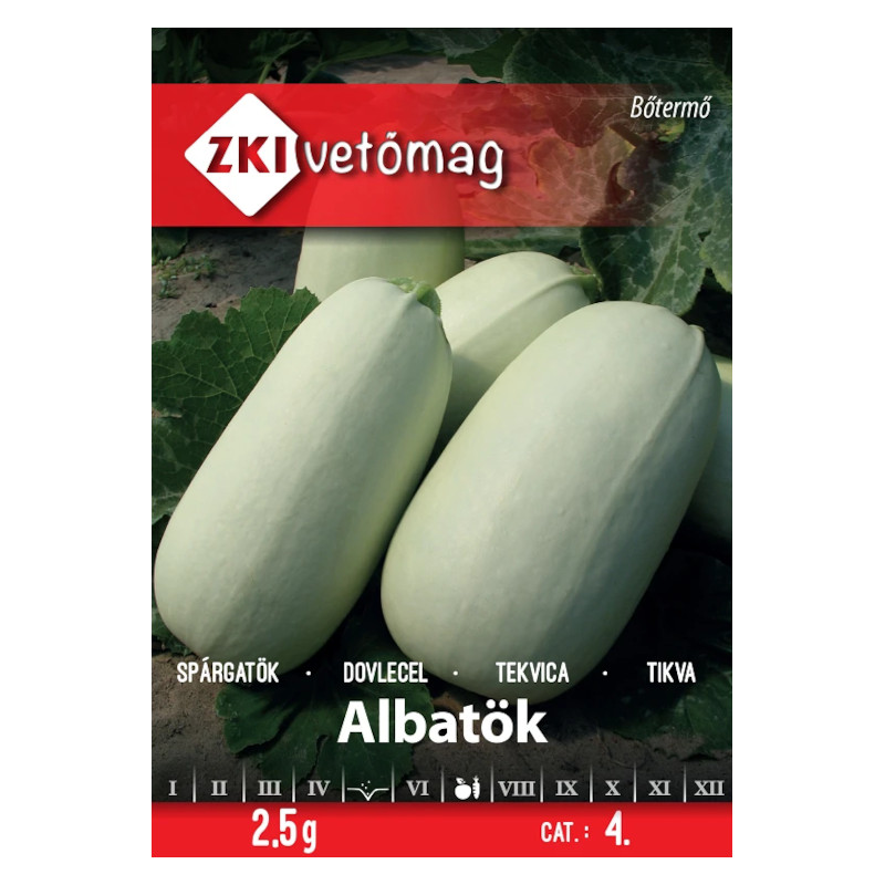 Spárgatök Alba (50 g) Korai érésű, bokor növekedésű, rövid indát fejlesztő, bőtermő fajta. Termése hengeres. Héja vastag, vajszínű, éretten sárga, felülete enyhén bordázott. Húsa zöldesfehér. Fólia alatti termesztésre és másodvetésre is alkalmas, a szárazságot jól tűri. [...] Részletek