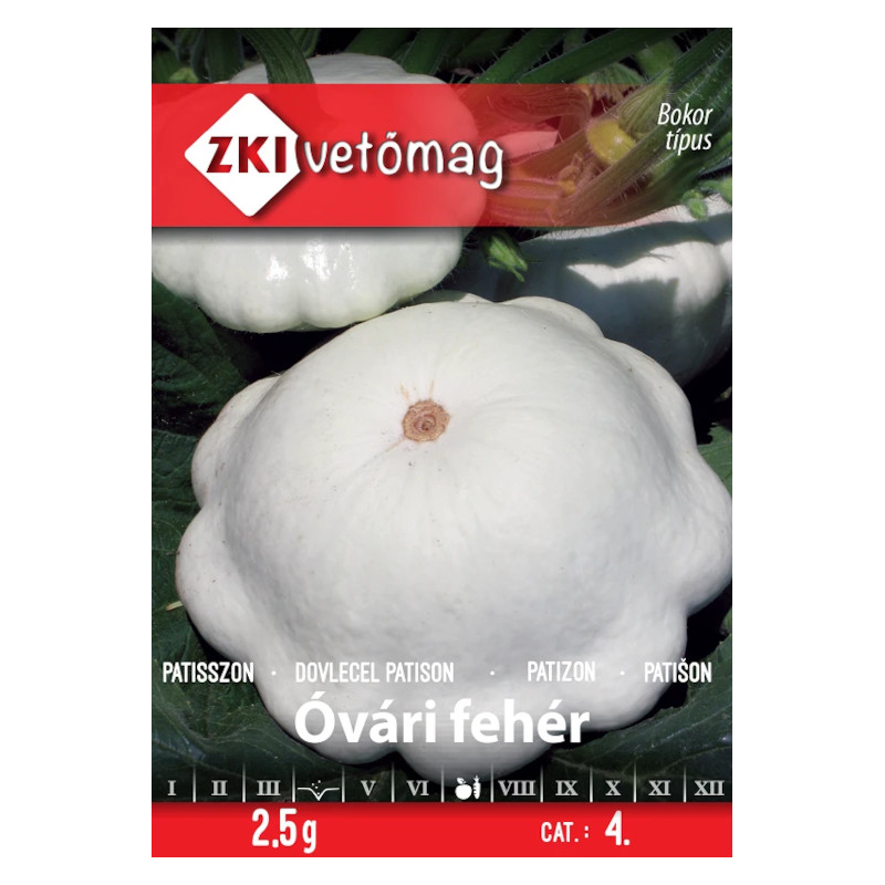 Patisszon Óvári fehér (50 g) Indátlan, szabadföldi termesztésre alkalmas fajta. Csillag alakú, vajszínű termése vastag húsú, 1-1,5 kg tömegű. Friss fogyasztásra és savanyításra alkalmas [...] Részletek
