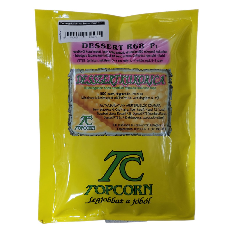 Csemegekukorica Dessert R68 F1 (1000 szem) Rendkívül korai érésű desszert típusú fajta. Az eddigi legkoraibb fajtánál, a Dessert 70-nél is korábban szedhető, mintegy 2 nappal. Vetőmagja erős, így a korai vetést jól tűri. A növény gyors kezdeti fejlődésű, jó vírusellenálló képességgel. Termése igen tetszetős: nagyméretű, zárt és sötétzöld csuhéborítással. Zsengébb és ízletesebb, mint a Dessert 70. [...] Részletek
