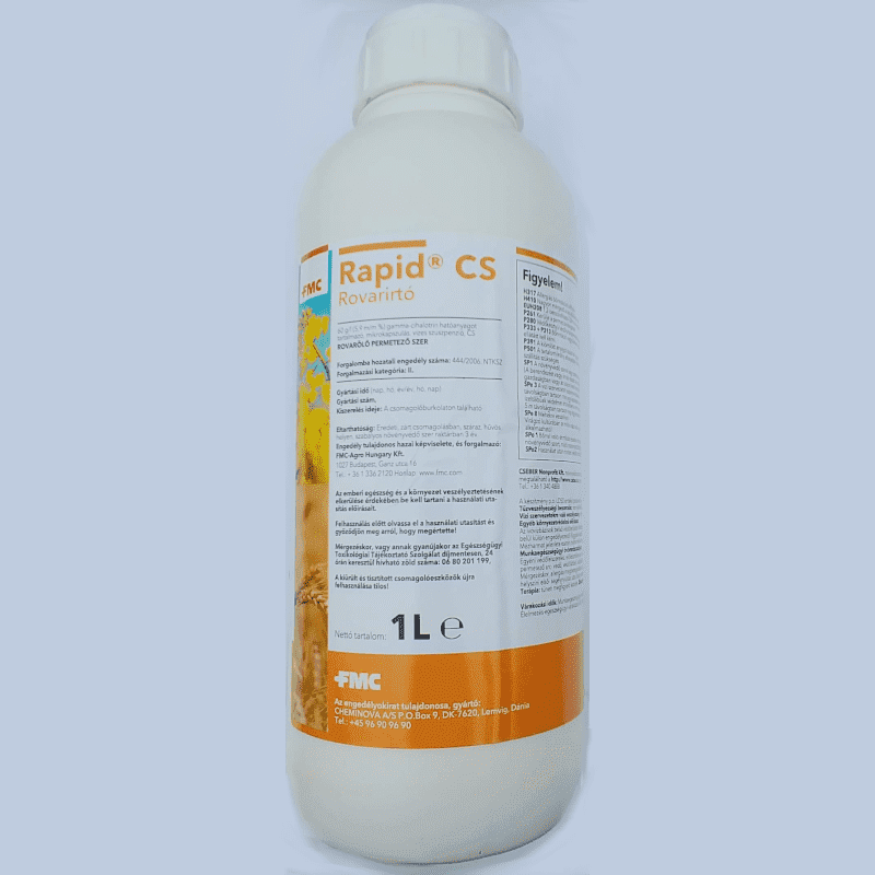 RAPID CS (1l) Folyékony rovarölő szer, kalászosok, őszi káposztarepce, napraforgó, borsó védelmére.Az engedélyező hatóság a gamma-cihalotrin hatóanyagot tartalmazó Rapid CS rovarölő permetezőszer (a továbbiakban: szer) 444/2006. NTKSZ számú határozatában megadott forgalomba hozatali és felhasználási engedélyét 2025. március 31-i hatállyal v i s s z a v o n j a. Az ügyfél a fenti határidő után magyarországi forgalomba hozatal céljából nem hozhatja be a szert. Az engedélyező hatóság a legkésőbb 2025. március 31-ig Magyarországra beérkezett szerre, valamint az értékesítési láncban meglévő készletek felhasználására türelmi időt biztosít az alábbiak szerint: Az ügyfél (engedélyes), továbbá a nagy- és kiskereskedők meglévő raktárkészleteiket 2025. szeptember 30-ig értékesíthetik. A szer felhasználása 2026. szeptember 30-ig engedélyezett. [...] Részletek