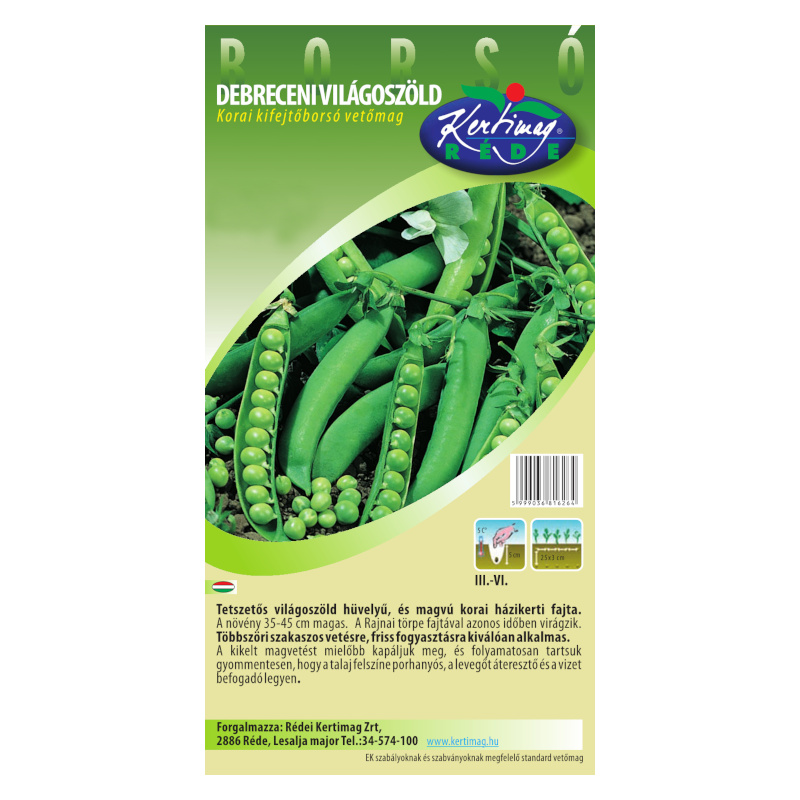 Zöldborsó, kifejtő Debreceni világoszöld (250 g) Kifejtőborsó! Korai, 35-45 cm magas. A Rajnai fajtával azonos időben virágzik. A világoszöld színű, 8-10 cm hosszú hüvelyek alakja egyenes, a végük hegyes. Hüvelyenként 8-10 db, világoszöld mag képződik. A magvak mérete 9-11 mm. Friss fogyasztásra, házi mélyhűtésre javasolt. [...] Részletek