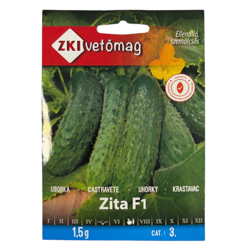 Uborka Zita F1 (1,5 g) Szabadföldi termesztésre kivaló, betegségellenálló konzervuborka fajta.Lombját sokáig megtartja, túlnyomórészt nővirágú.Termése mérsékelten szemölcsös, keseredésmentes, ropogós húsú.Csemege és kovászos uborkának is kiválóan alkalmas. (kb. 70-80 szemet tartalmaz) [...] Részletek