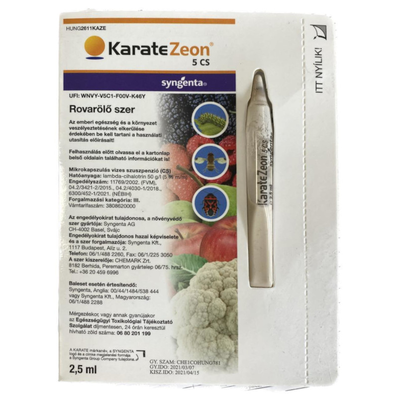 KARATE ZEON 5 CS (2,5ml) Széles spektrumú piretroid típusú rovarölő szer. A jól ismert piretroid speciális Zeon formulációban a hosszabb tartamhatás, az erősebb tapadás érdekében. [...] Részletek