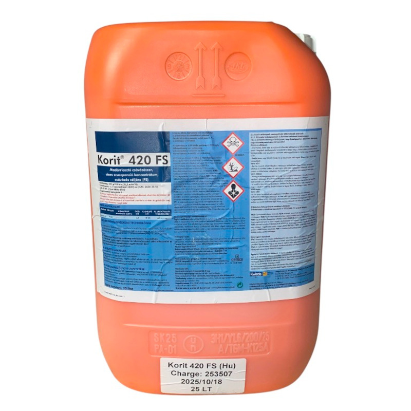 KORIT 420 FS (25l) A készítmény fácánok elleni repellens (riasztó) hatással rendelkezik. Kukoricában a csávázószert nedves csávázás formájában egyenletesen kell a magvak felületére felvinni. A csávázáshoz a javasolt vízmennyiség 10?20 l/ vetőmag tonna. A készítményt kizárólag vetőmag csávázására használható. A csávázott vetőmagot étkezési és takarmányozási célra felhasználni és ilyen rendeltetésű termékekkel együtt tárolni tilos. [...] Részletek