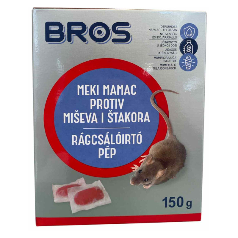 Bros rágcsálóirtó pép az egerek és patkányok korlátozására. A pép olyan csalétket tartalmaz, mely erősen vonzza a rágcsálókat és az már az első alkalmazáskor hatásos.