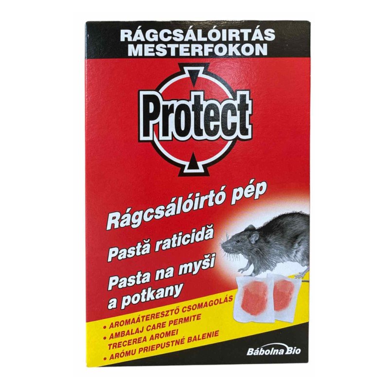 Csökkentett hatóanyag tartalmú, biztonságos rágcsálóirtó szer. A PROTECT? rágcsálóirtó pép egy olyan új összetételű termék, amely a patkányok és egerek által rendkívül kedvelt ízénél és korszerű bromadiolon véralvadásgátló hatóanyagánál fogva lehetővé teszi az óvatos kártevők gyors és biztos kiirtását. A bromadiolon késleltetett hatása miatt a rágcsálók nem gyanakodnak, így a patkányok és egerek könnyen elpusztíthatók.