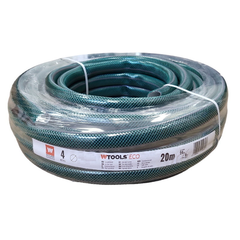 Locsolótömlő Wtools ECO, zöld, 4 rétegű 1" (20 m) 4 rétegű, max. 24 bar nyomást bíró, zöld színű locsolótömlő [...] Részletek