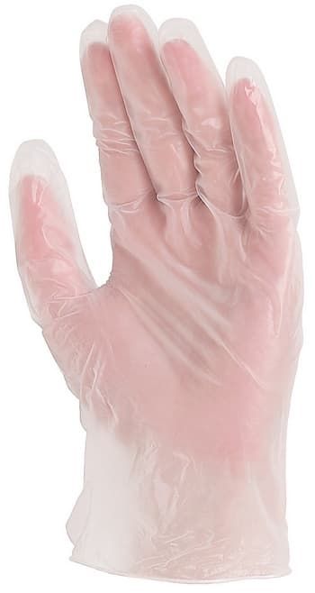 Fehér színű, egészségügyi, egyszer használatos vinil kesztyű.