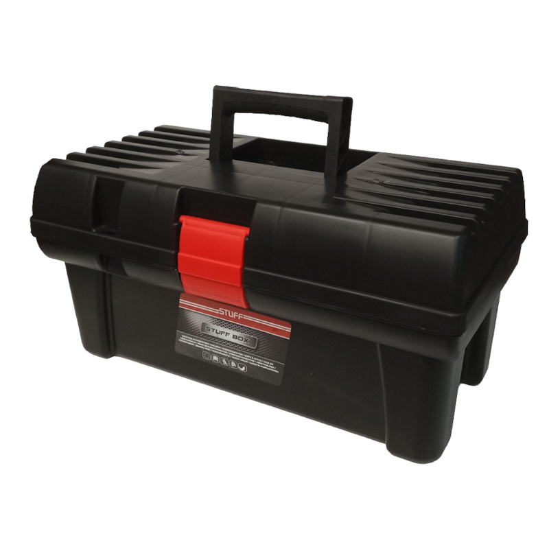 Fekete műanyag szerszámosláda, felül rendezővel 20"-os tálcával és csatokkal. Lehetővé teszi a szerszámok helytakarékos és rendezett tárolását.