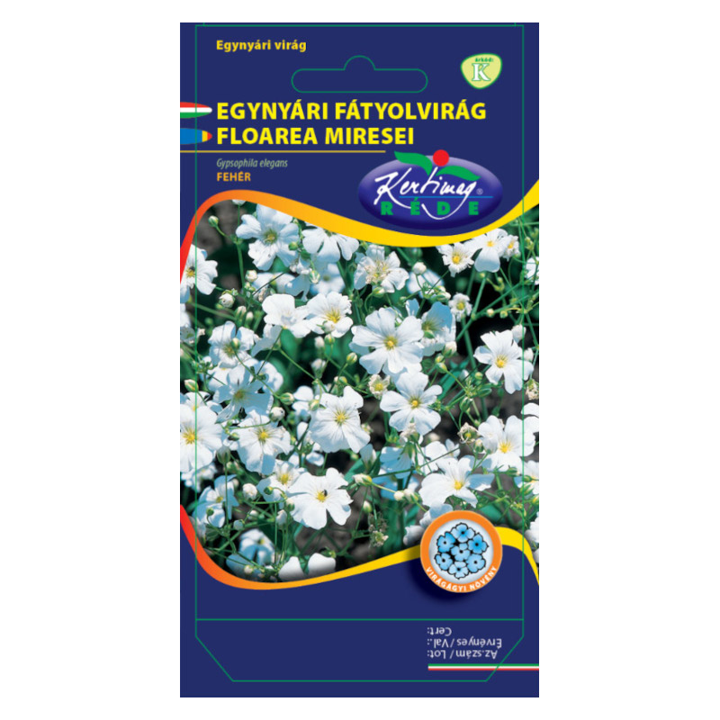 Egynyári fátyolvirág (Gypsophila elegans) fehér (2 g) Virágkötészeti alapanyag, csokorlazítónak használják. Vetés után 6 héttel virágzik. Virágzási ideje nagyon rövid, ezért május végéig folyamatosan ültethető. 60-80 cm magas, lazán elágazó, kevés levelű növény. [...] Részletek