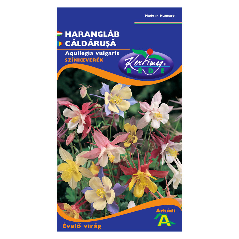 Harangláb (Aquilegia vulgaris) színkeverék (0,25 g) Lazán elágazó, 50-100 cm magas, évelő dísznövény. Hármasan tagolt, csipkés szélű levelei enyhén szőrösek. 4-6 cm-es virágai 5 színes csészelevélből és 5 sarkantyús sziromlevélből állnak, gazdag színárnyalatokban. Végleges helyére augusztus-szeptemberben ültethető. Virágzás után visszahúzódik. Legszebben üde, jó minőségű talajban, félárnyékban fejlődik. [...] Részletek