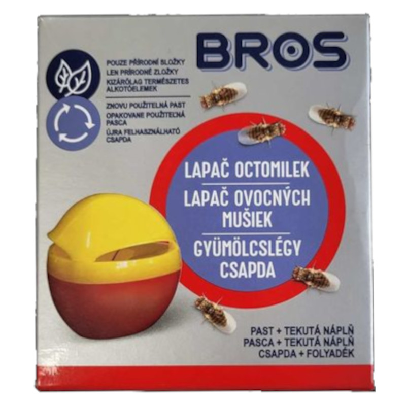 Bros gyümölcslégy csapda, csalianyaggal (15 ml) A csapda kontrolálja a gyümölcslegyeket. Az aromás folyadék vonzza a rovarokat a csapdába, melynek speciális kialakítása tartja bent azokat. Új, javított összetételű folyékony csali, amely a csapdát rendkívül hatékonnyá teszi. Nem tartalmaz rovarölő szereket, kizárólag természetes eredetű alkotóelemeket tartalmaz. [...] Részletek
