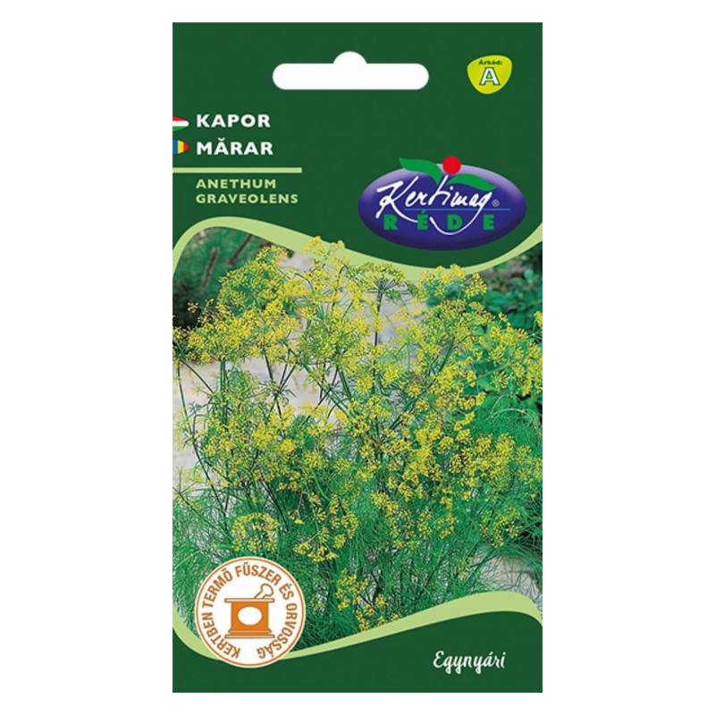 Kapor (Anethum graveolens) (3 g) Legelterjedtebb egyéves fűszer-növényünk, nem hiányozhat a konyhakertből. Napos helyet, tápanyagban gazdag talajt igényel. Szakaszosan vetve mindig friss és zsenge hajtásokat nyerünk. Jó szomszédja a babnak, borsónak, uborkának, céklának és hagymának. Felhasználás: uborka konzerválásához, fűszerecet készítéséhez, saláták ízesítéséhez. A leveles hajtásokat frissen vagy szárítva használjuk. Virágos hajtásaiból emésztést serkentő, szélhajtó teát készíthetünk. [...] Részletek