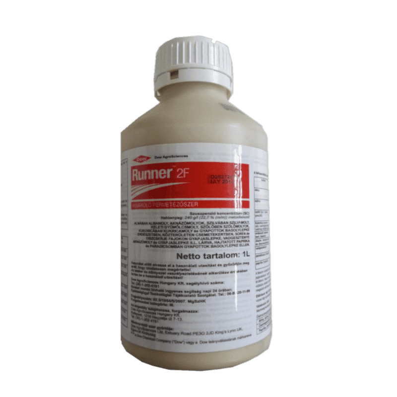 RUNNER 2 F (1l) Védelem a molykártevők ellen. A Runner 2F hatásmódja egyedülálló: ún. vedlést beindító és felgyorsító hatással bír. Egyedi hatásmechanizmusú, környezetbarát, szelektív rovarölő szer. Kitűnő tojásölő és egyedülálló lárvaölő hatással. [...] Részletek