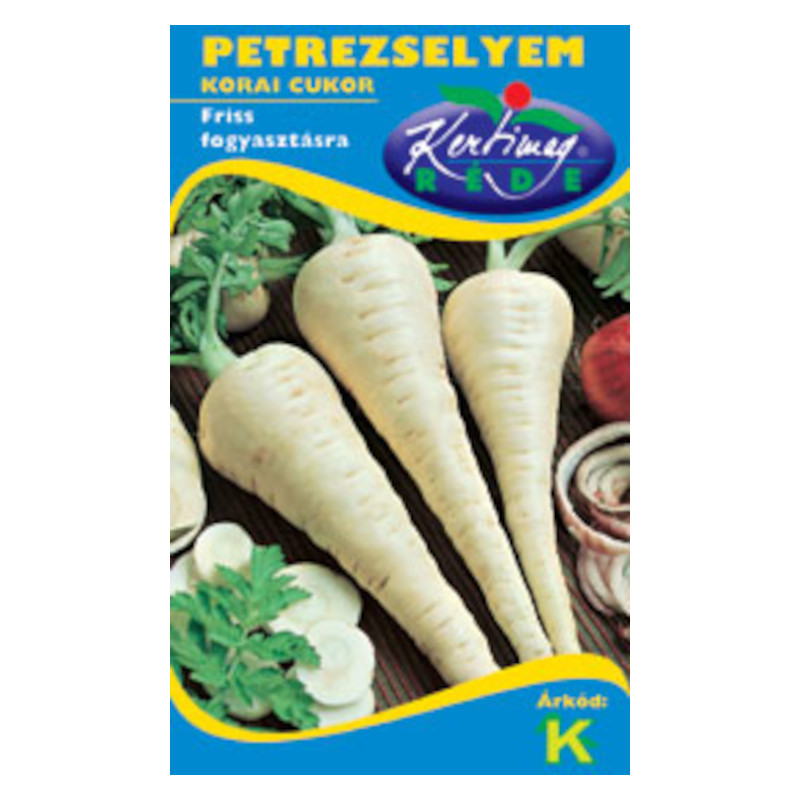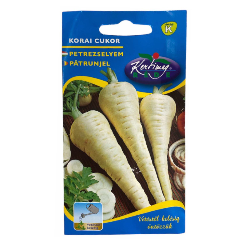 Petrezselyem Korai cukor (5 g) Korai, szabadföldi és fólia alatti termesztésre alkalmas fajta. Legkorábban szedhető, tenyészideje mindössze 140?150 nap. Széles vállú, hirtelen elkeskenyedő gyökérzetű. Vállszélessége 5?6 cm, hosszúsága 12?15 cm. Levélzete középerős. A hús színe fehér. Tápanyagigénye nagy, eredményesen laza és középkötött talajon termeszthető. Friss fogyasztásra alkalmas fajta. (A tasak kb. 4000?4200 szem vetőmagot tartalmaz.) [...] Részletek