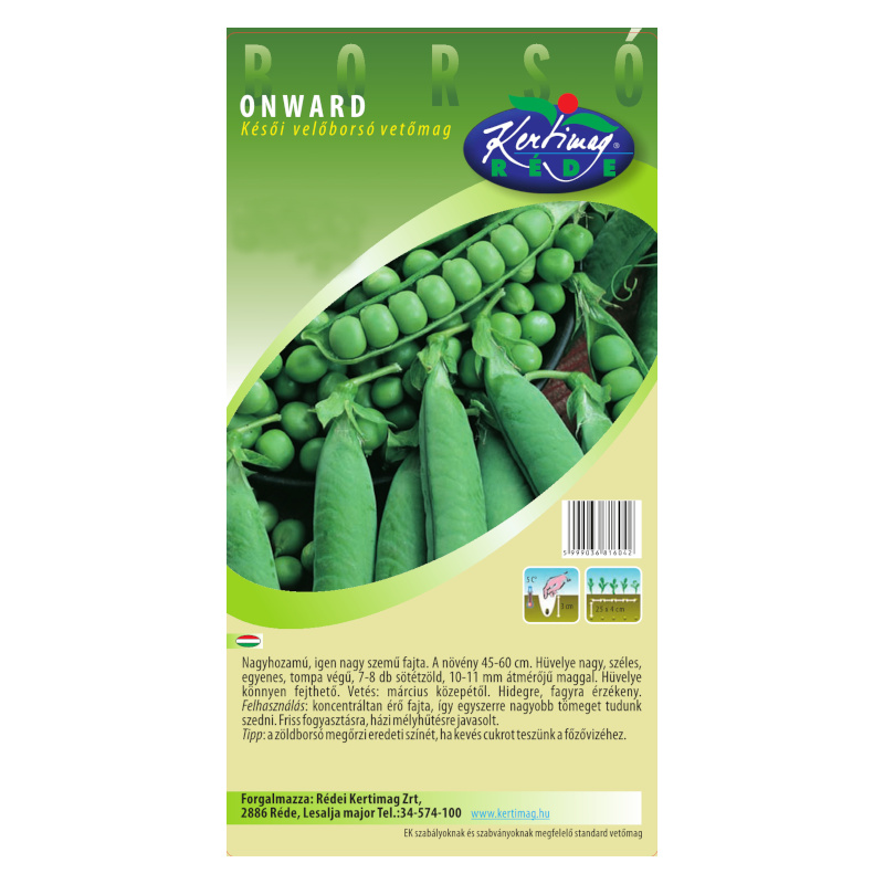 Zöldborsó, velő, kései Onward (250 g) Késői velőborsó! Nagy hozamú, igen nagy szemű fajta. A növény 45-60 cm. Hüvelye nagy, széles, egyenes, tompa végű, 7-8 db sötétzöld, 10-11 mm átmérőjű maggal. Hüvelye könnyen fejthető. Koncentráltan érő fajta, így egyszerre nagyobb tömeget tudunk szedni. [...] Részletek