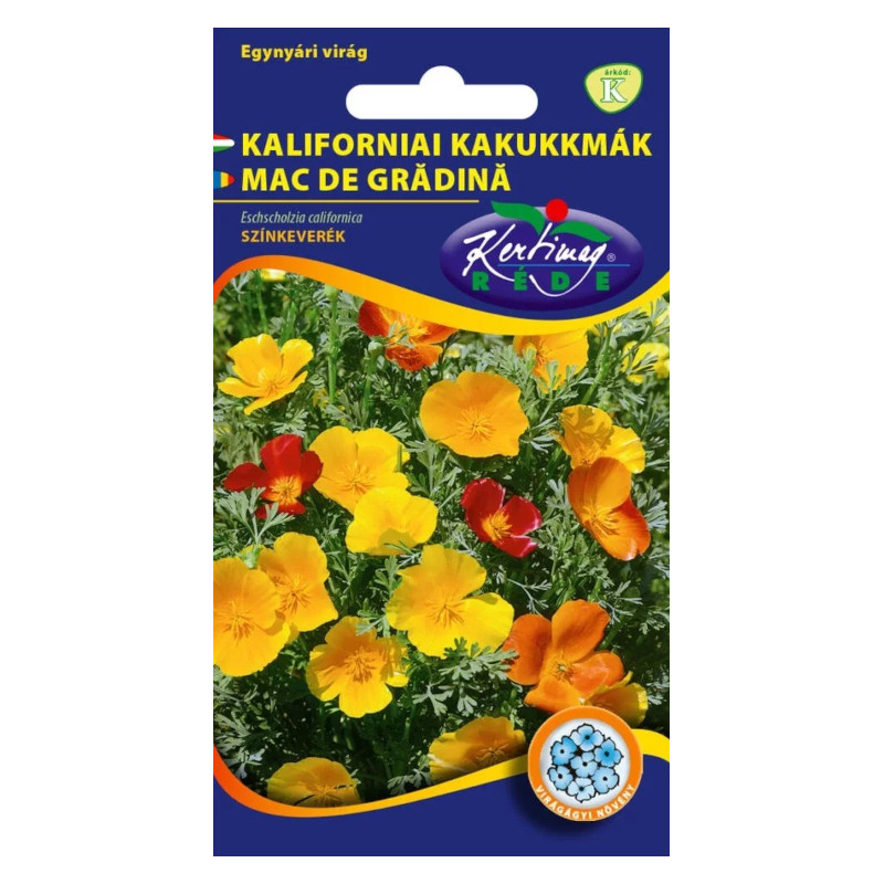 Kaliforniai kakukkmák (Eschscholzia californica) egyszerű virágú színkeverék (1 g) Könnyen termeszthető, egész nyáron át virágzó növény. 25-30 cm magas, virágágyba, virágtálakba ültethető. Élénk színei miatt hatásos színfolt. Az elnyílt virágokat lemetszve tovább virágzik. [...] Részletek