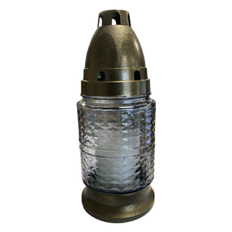 Mécses LA353, antikolt műanyag tetejű üvegmécses, színtelen (165 mm) Antikolt műanyag tetejű üvegmécses, az üvegen domború kristály minta látható. [...] Részletek
