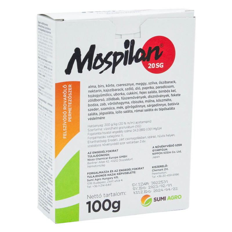 MOSPILAN 20 SG (100g) A kiváló hatékonyságú MOSPILAN rovarölőszer fejlettebb SG granulátum formulációban, felszívódó, rovarölő permetezőszer: alma, körte, cseresznye, meggy, szilva, őszibarack, nektarin, dió, kukorica, őszi káposztarepce, mustár, olajretek, napraforgó, dohány, paprika (hajtatott), paradicsom (hajtatott), tojásgyümölcs (hajtatott), uborka (hajtatott), cukkini (hajtatott), saláta (szabadföldi és hajtatott), bimbós kel, fűszernövények, dísznövények, erdészeti kultúrák védelmére. [...] Részletek