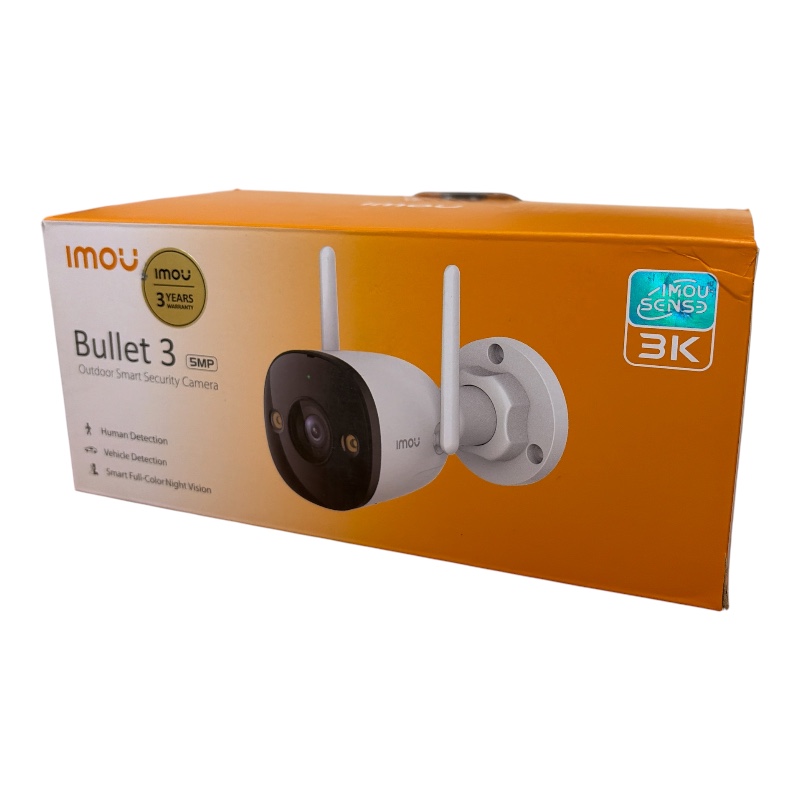 A Bullet 3 5MP 5 megapixeles élőképes megfigyelést biztosít, választható 2,8 mm-es vagy 3,6 mm-es objektívvel. Négyféle éjjellátó módot támogat, így még teljes sötétségben is nappalihoz hasonlóan tiszta képet nyújt. Az IP67 védettségnek köszönhetően a kamera kültéri használatra is alkalmas, és megbízhatóan működik különböző időjárási körülmények között is. A beépített reflektor és a 110 dB-es biztonsági sziréna aktívan segít távol tartani a nem kívánt látogatókat. A saját fejlesztésű IMOU SENSE algoritmusnak köszönhetően az ember- és járműészlelés még pontosabb.
